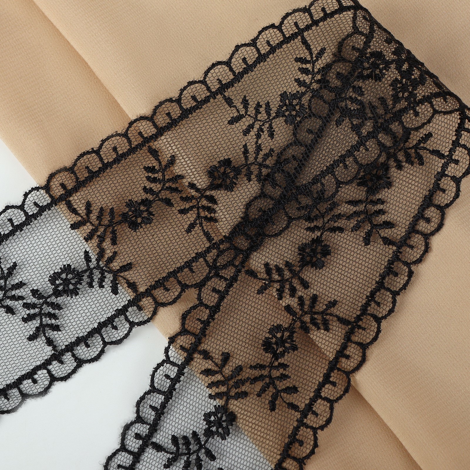 Неэластичная ткань с изысканным повторяющимся узором по краю. Кружево не тянется, а тонкая сетка придаёт любому изделию с кружевом лёгкости и элегантности. С таким кружевом удобно работать, ткань легко драпируется и не крошится по краям. Можно использовать для пошива нижнего белья, платьев, топов, палантинов, а также для декорирования аксессуаров.